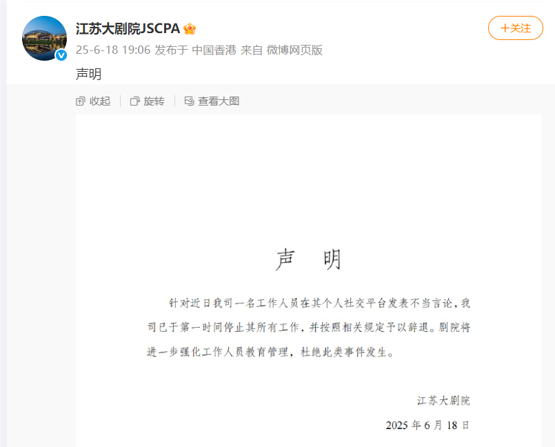 针对近日江苏大剧院一名工作人员在其个人社交平台发表不当言论,江苏大剧院已于第一时间停止其所有工作,并按照相关规定予以辞退。剧院将进一步强化工作人员教育管理,杜绝此类事件发生。